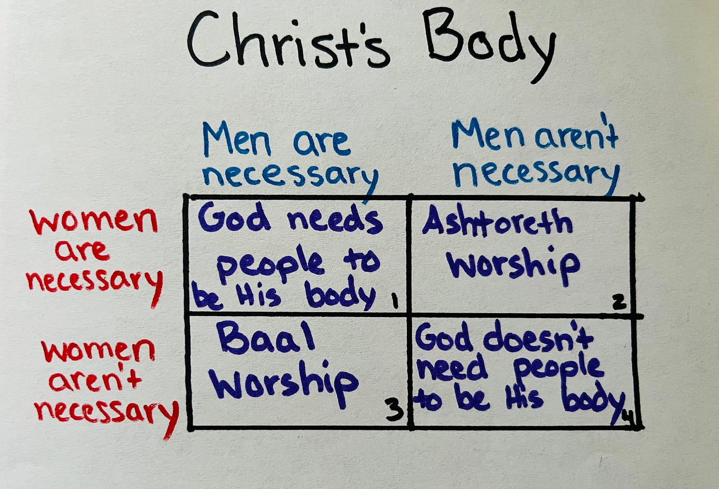 This is my graph illustrating the various viewpoints on who is necessary in Christ’s body. Are men necessary? Are women? Are neither? Here are explanations of each. I begin at the bottom with Box 4. By the way, all these beliefs are incorrect.