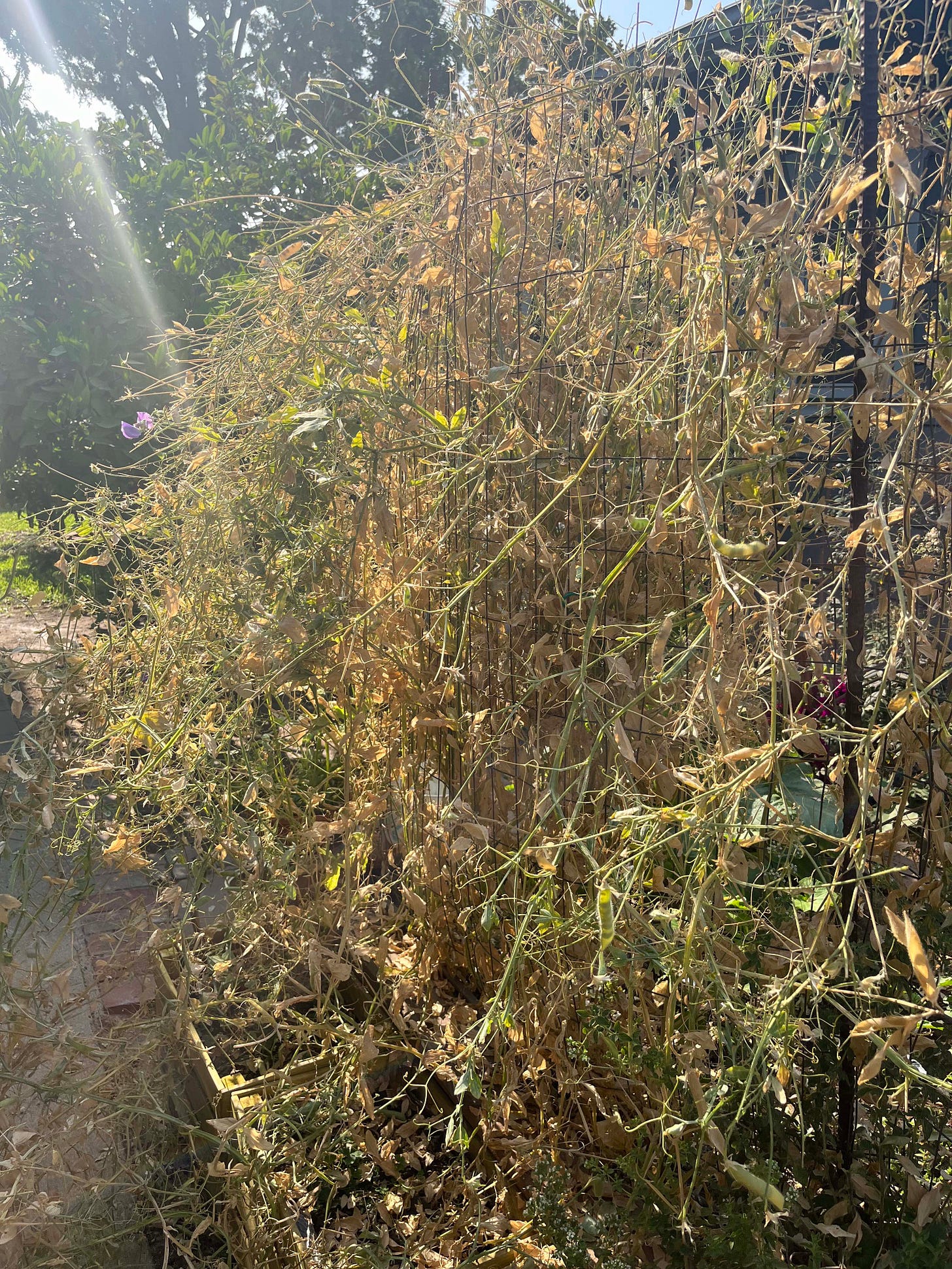I've pulled the sweet peas off the trellis. They form a tan and green tumbleweed. Their dry pods rattled in the yanking, And their ripped tendrils remain on the wires. I'll heap the still-green pods on the step to crisp and dry in the hot July heat. And maybe my small son will find them a temptation to pop and collect in a jar. And I'll leave the red shears beside The bird's nest of vines for my eldest Who can't resist an open invitation To dice and chop to smithereens. The dying creepers invited my work. The aftermath compelled me to write. And perhaps these words invite you To see and accept invitations laid out By another like letters in your mailbox.