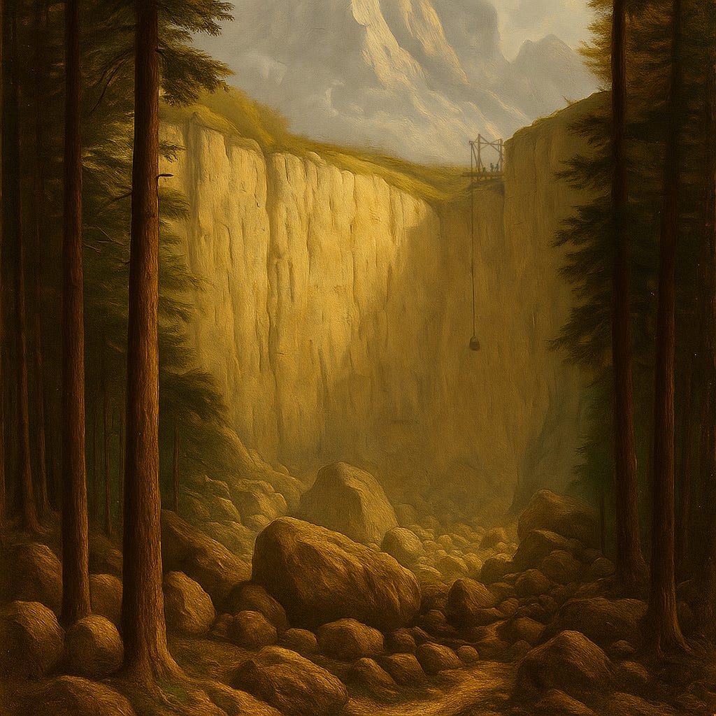 From the safety of the trees, they could see the towering cliffs looming up towards the mountains beyond. Beneath the cliffs lay a field of scree and boulders, and at the top of the cliff was a wooden trellis supporting a rope and a basket.